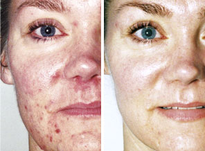 Før Exuviance-behandling mot akne. Etter Exuviance-behandling mot akne